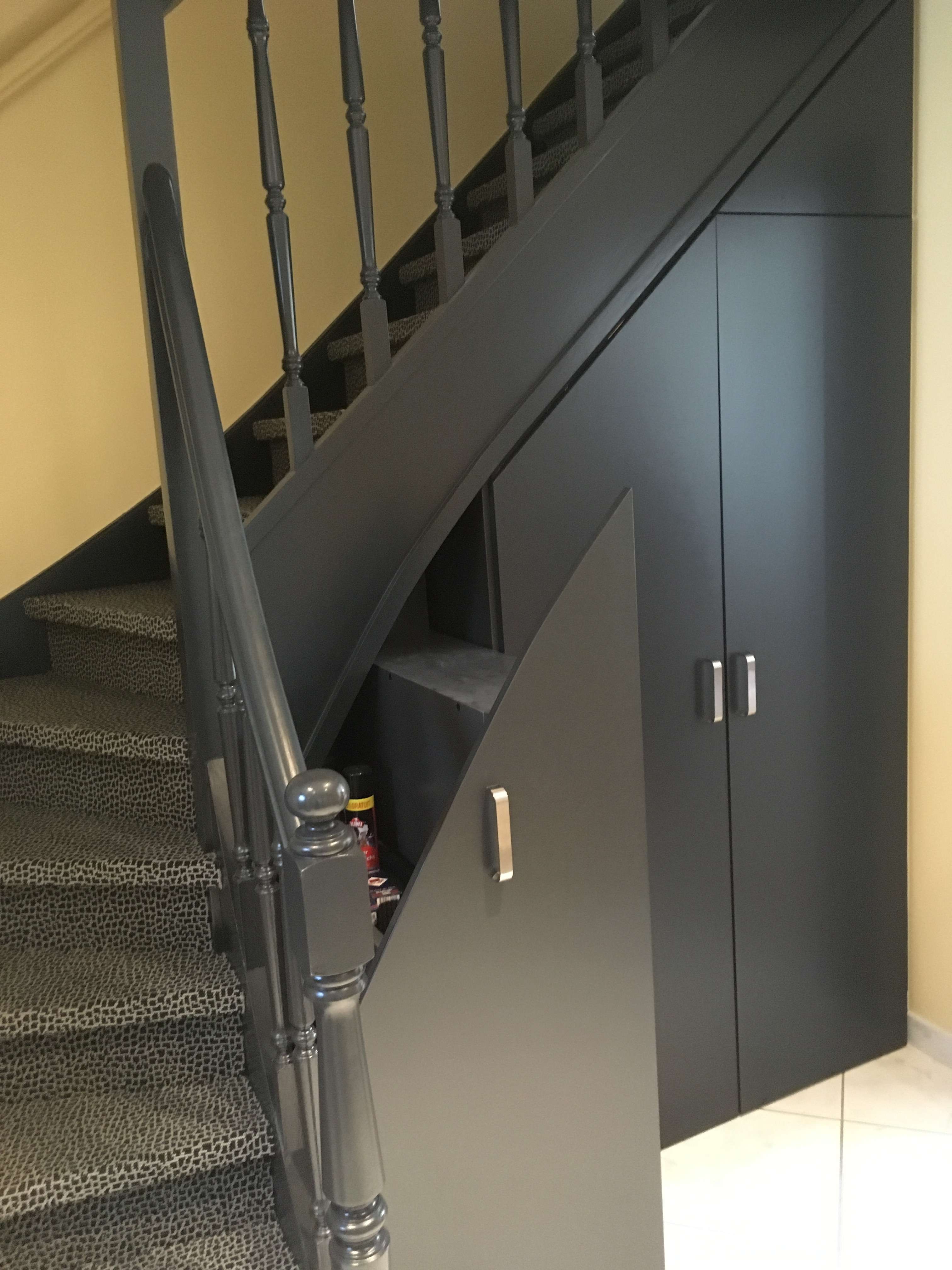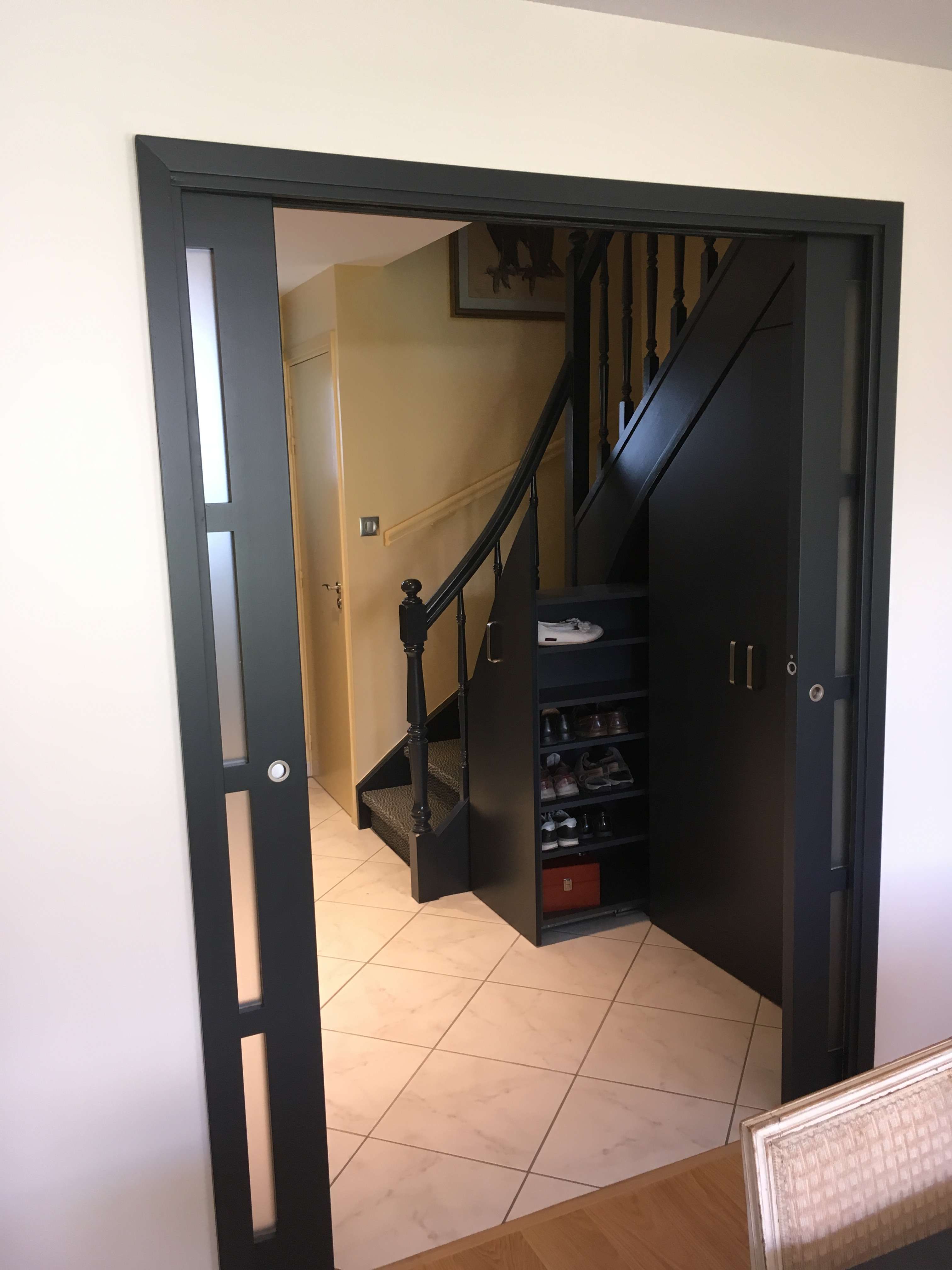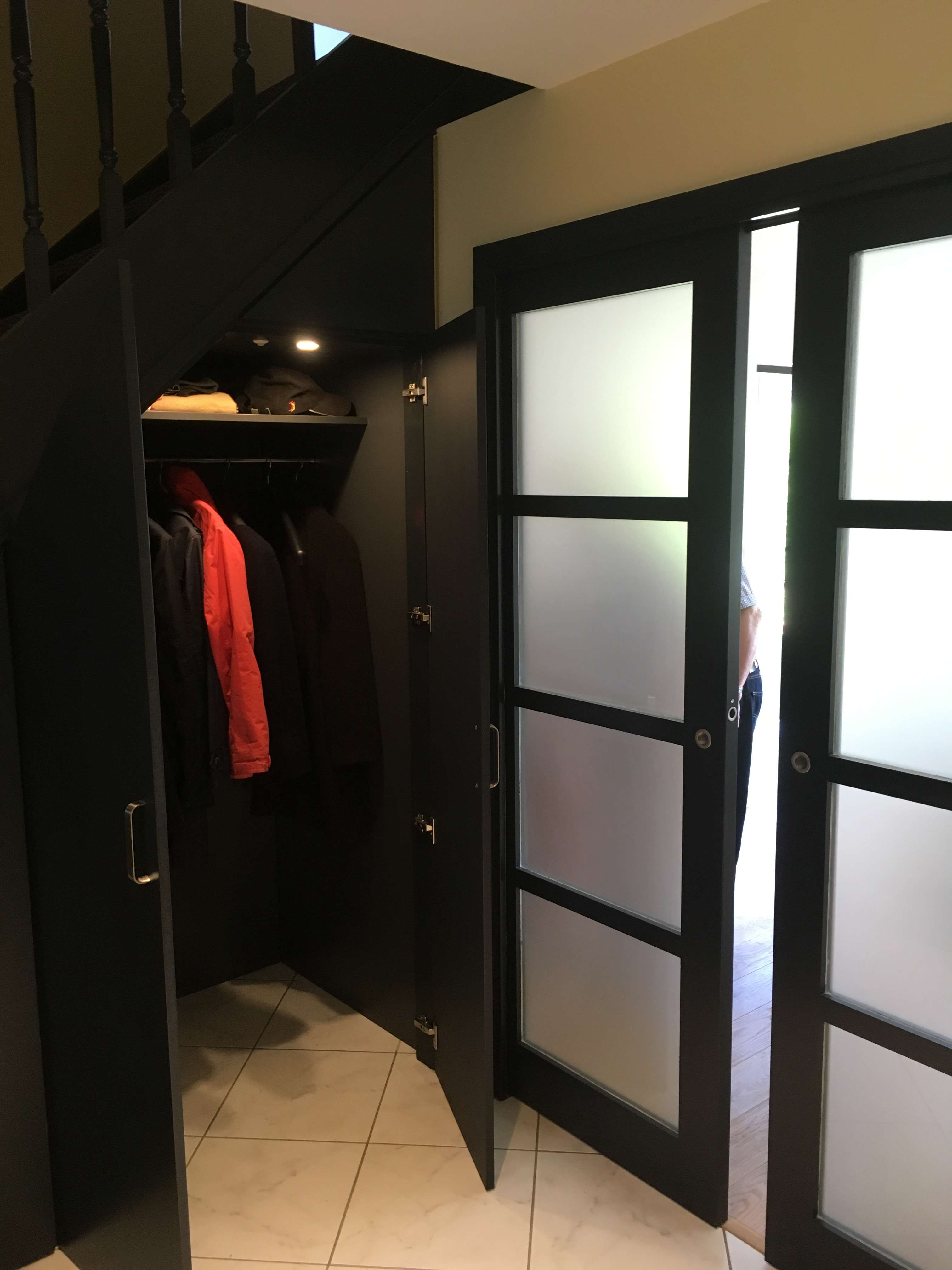 designL'espace sous l'escalier a été optimisé jusque sous la partie la plus basse par la création de rangements à chaussures; Les parties les plus hautes ont été aménagées en penderie et étagères. Un éclairage automatique s'allume avec l'ouverture des portes, rendant l'ensemble accueillant et particulièrement fonctionnel.