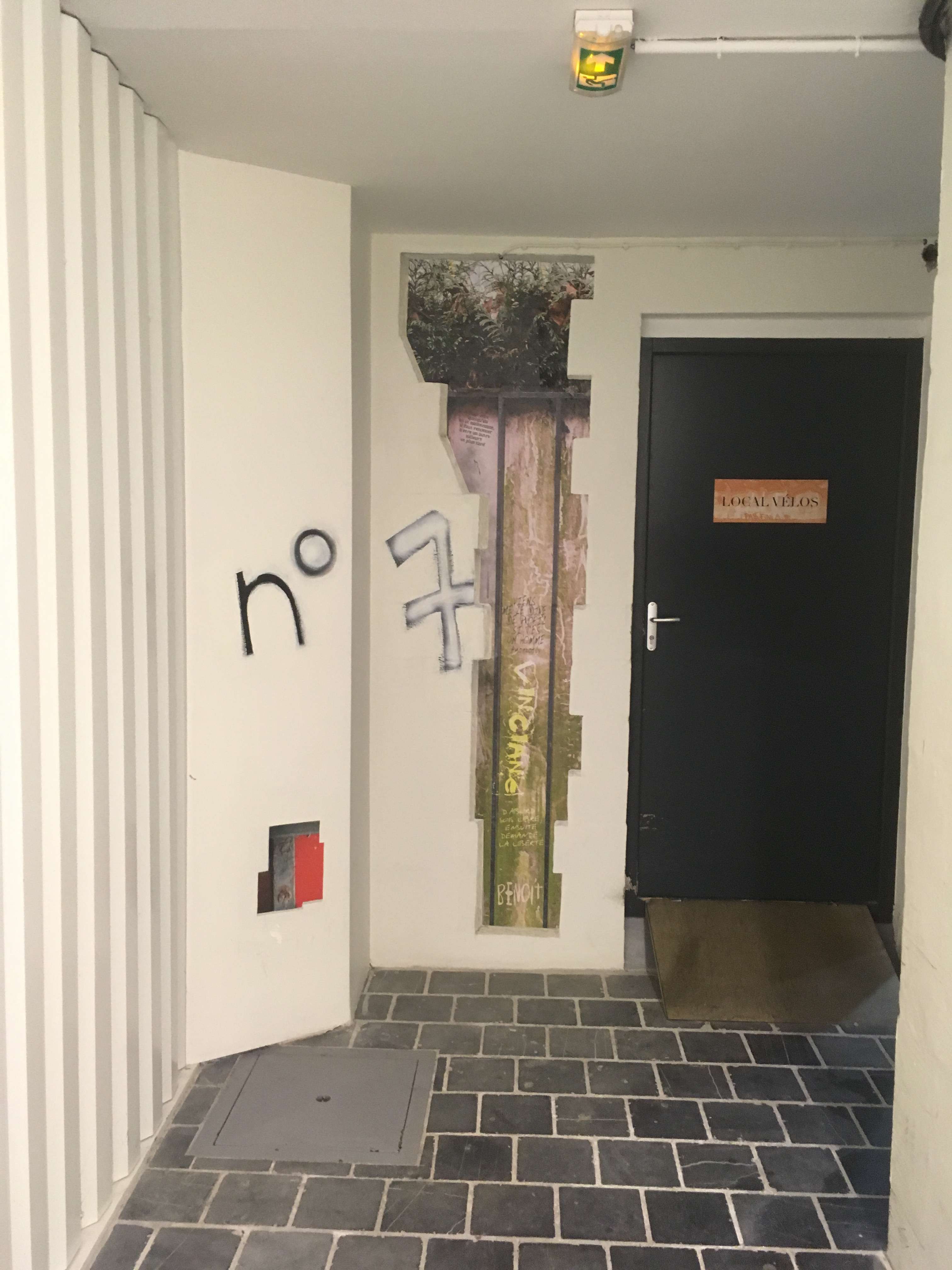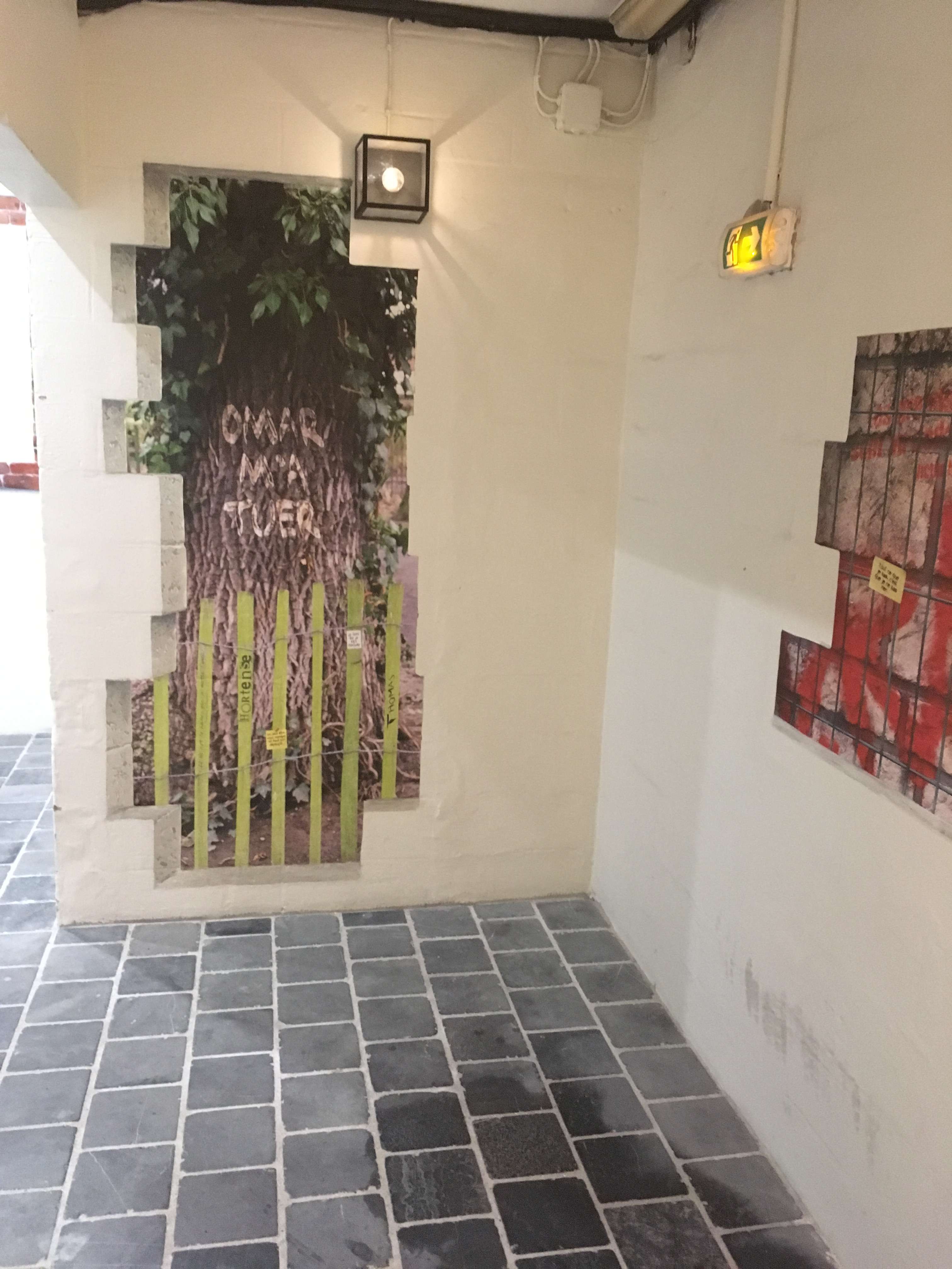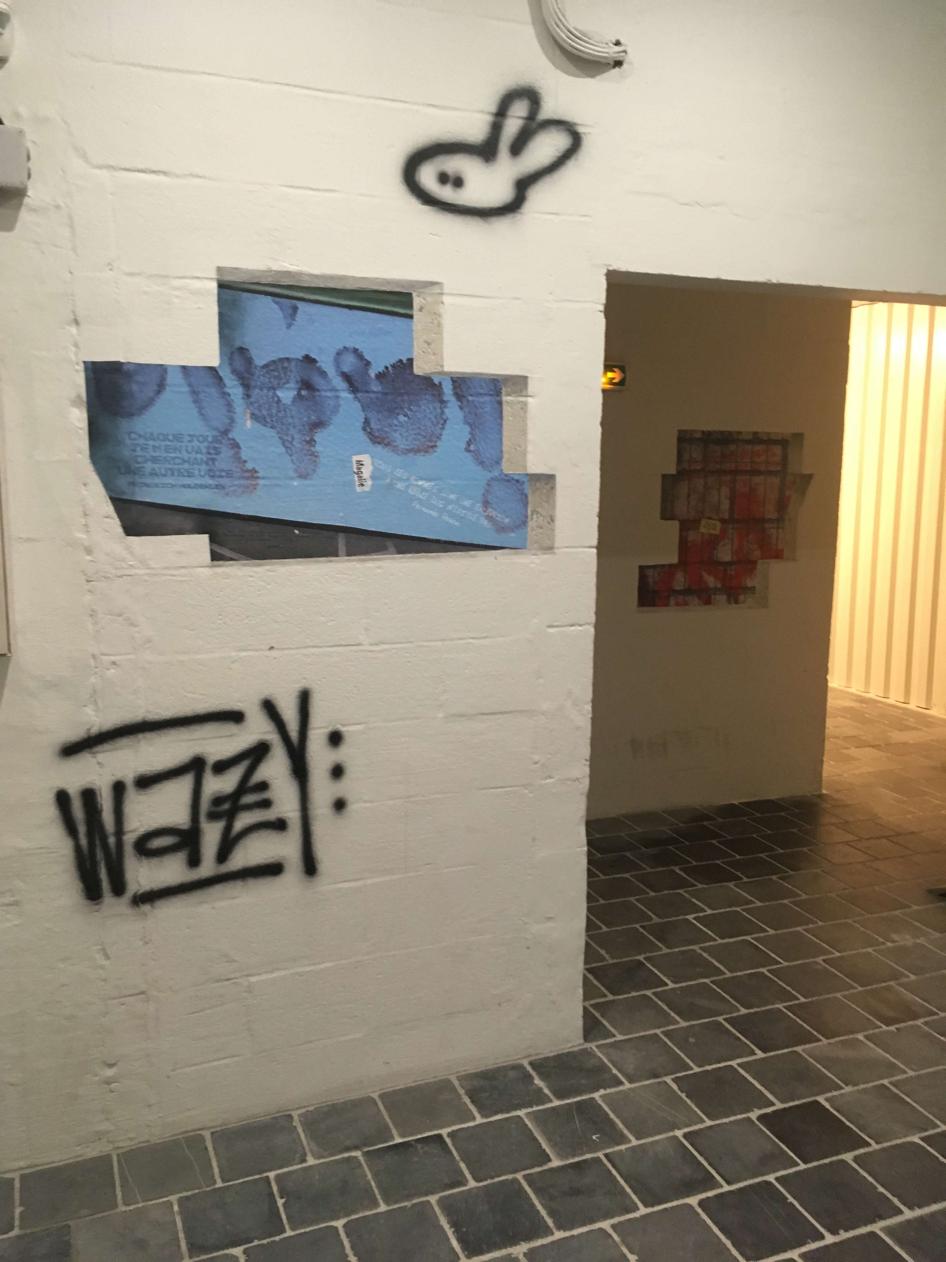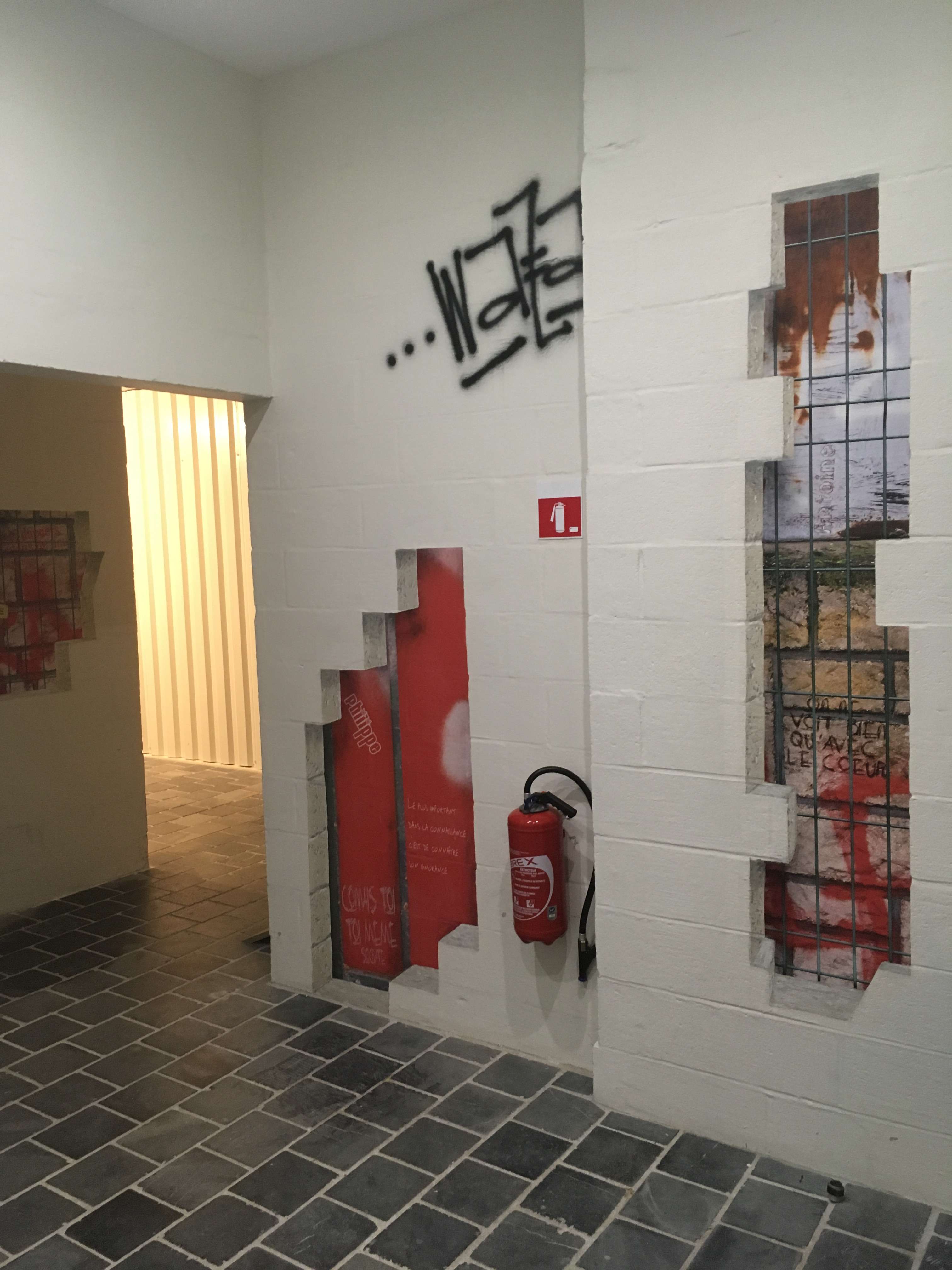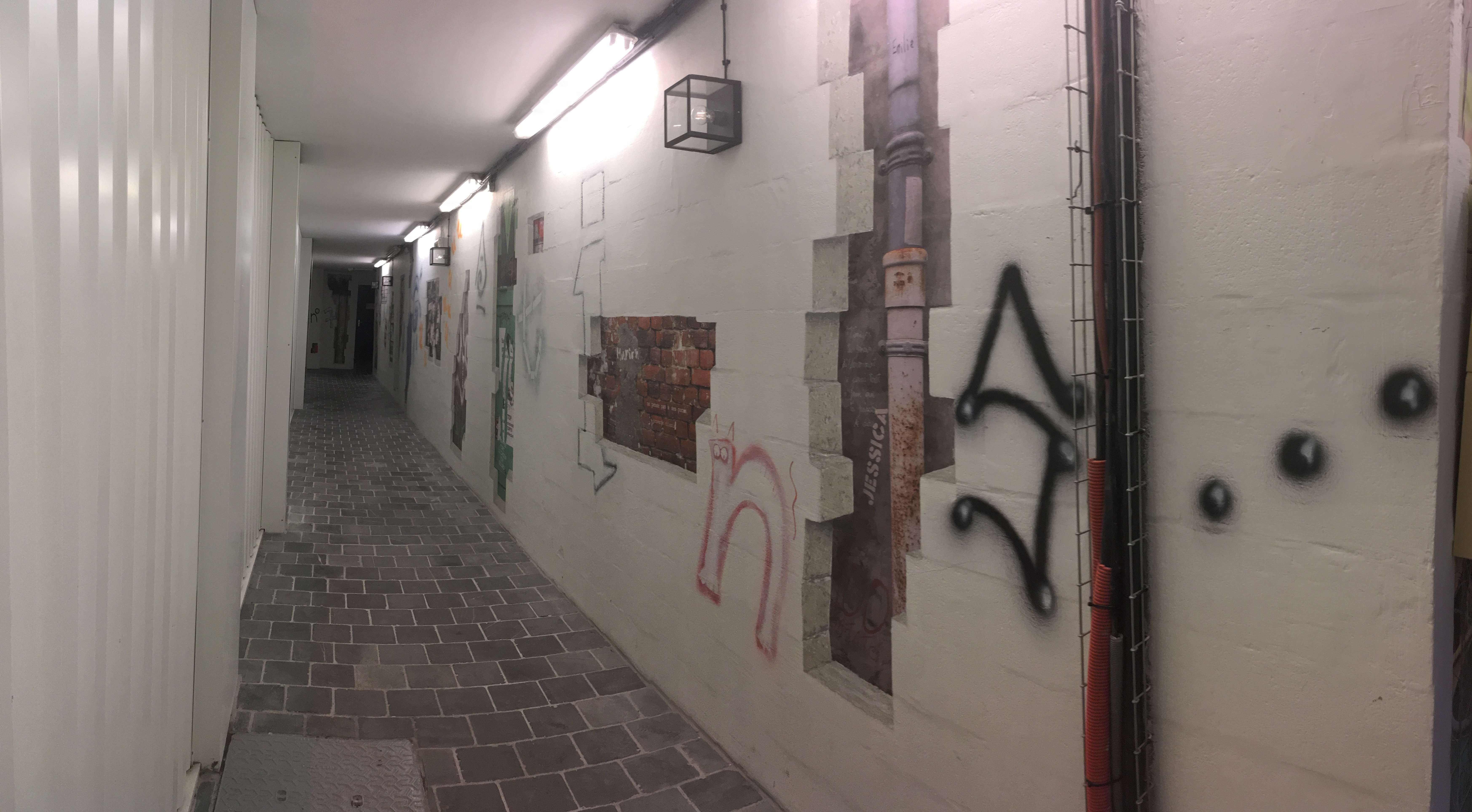 designPour ce long couloir sombre menant aux ascenseurs desservant des étages de bureaux, j'ai souhaité recréer une ambiance de vieille rue pavée, où l'humour et l'inattendu de tags rompraient la monotonie de la déambulation.