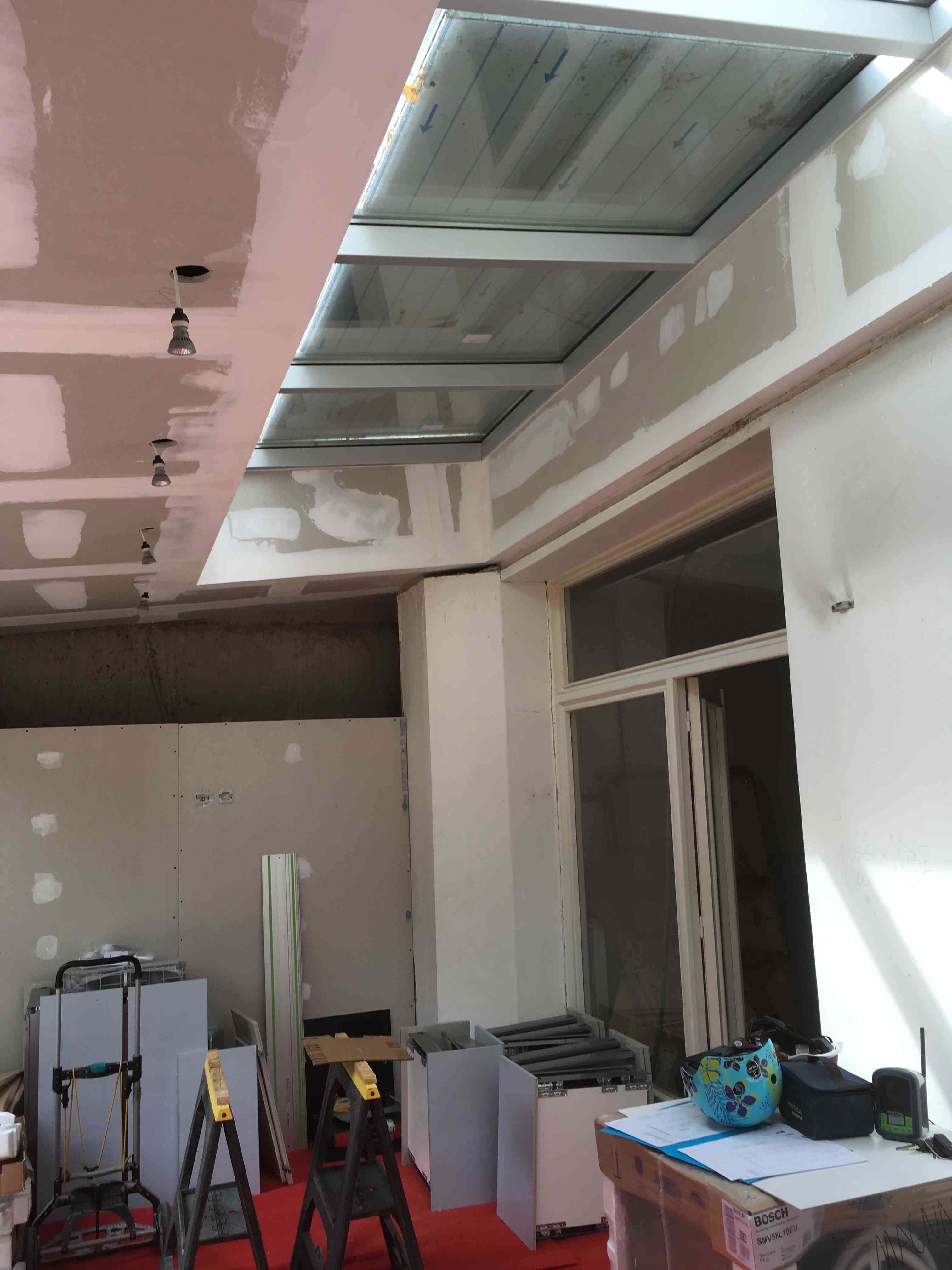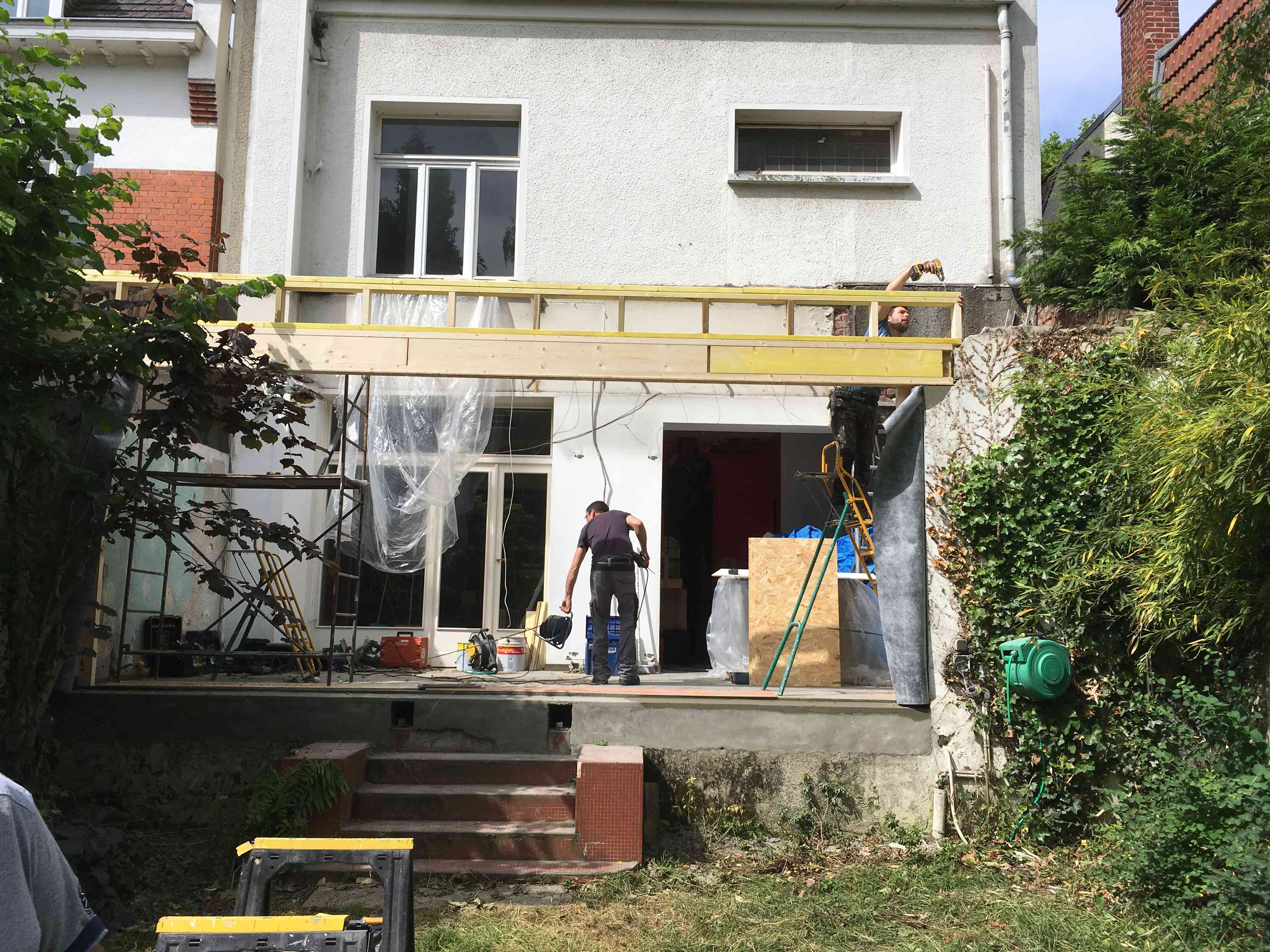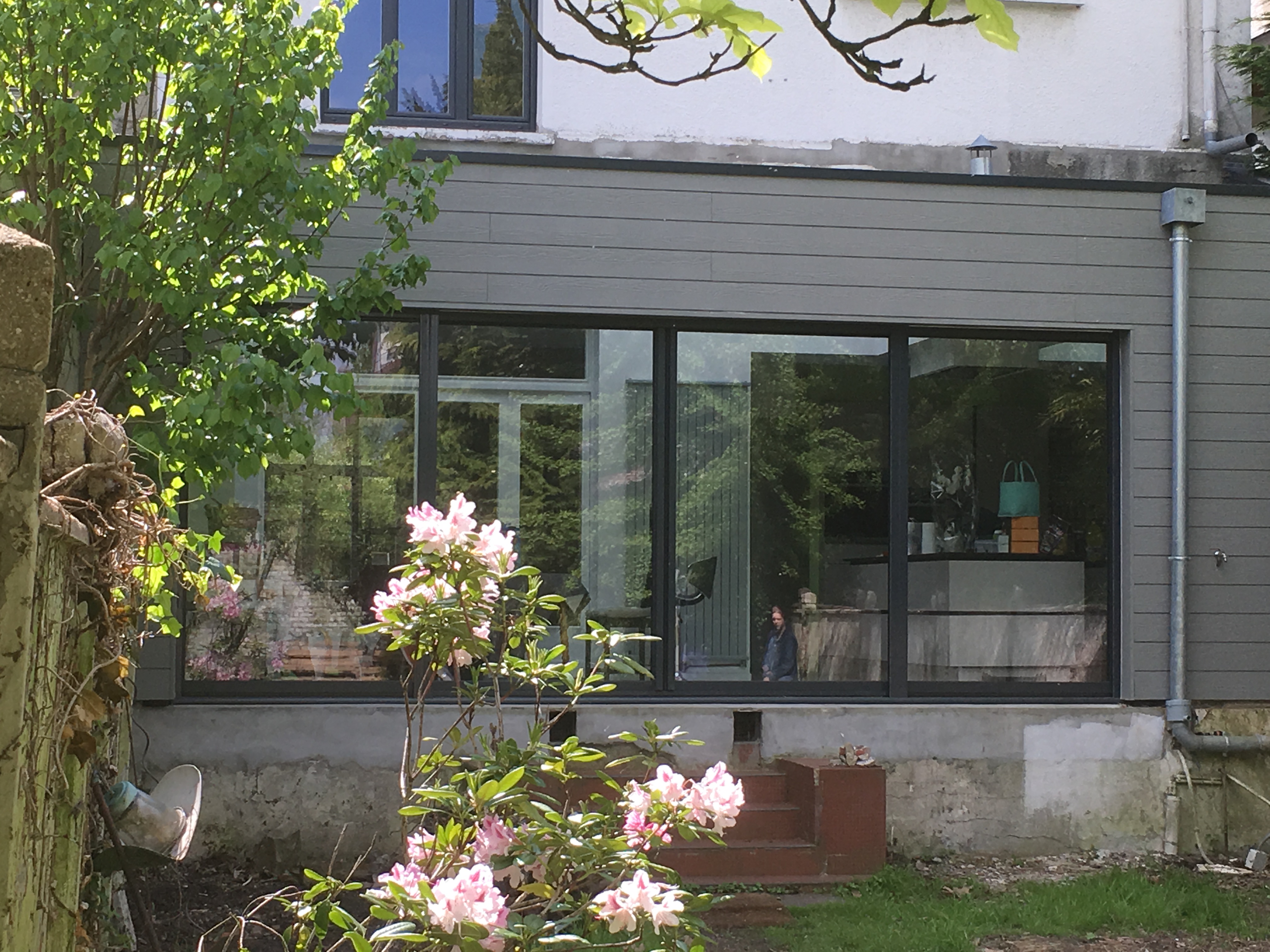 particuliersLe style véranda a été abandonné au profit d’une pièce de vie avec une toiture isolée et une partie verrière amenant une belle lumière zénithale. De grande baies ont été aménagées sur le jardin où une terrasse est prévue pour prolonger l’espace repas dans la verdure.