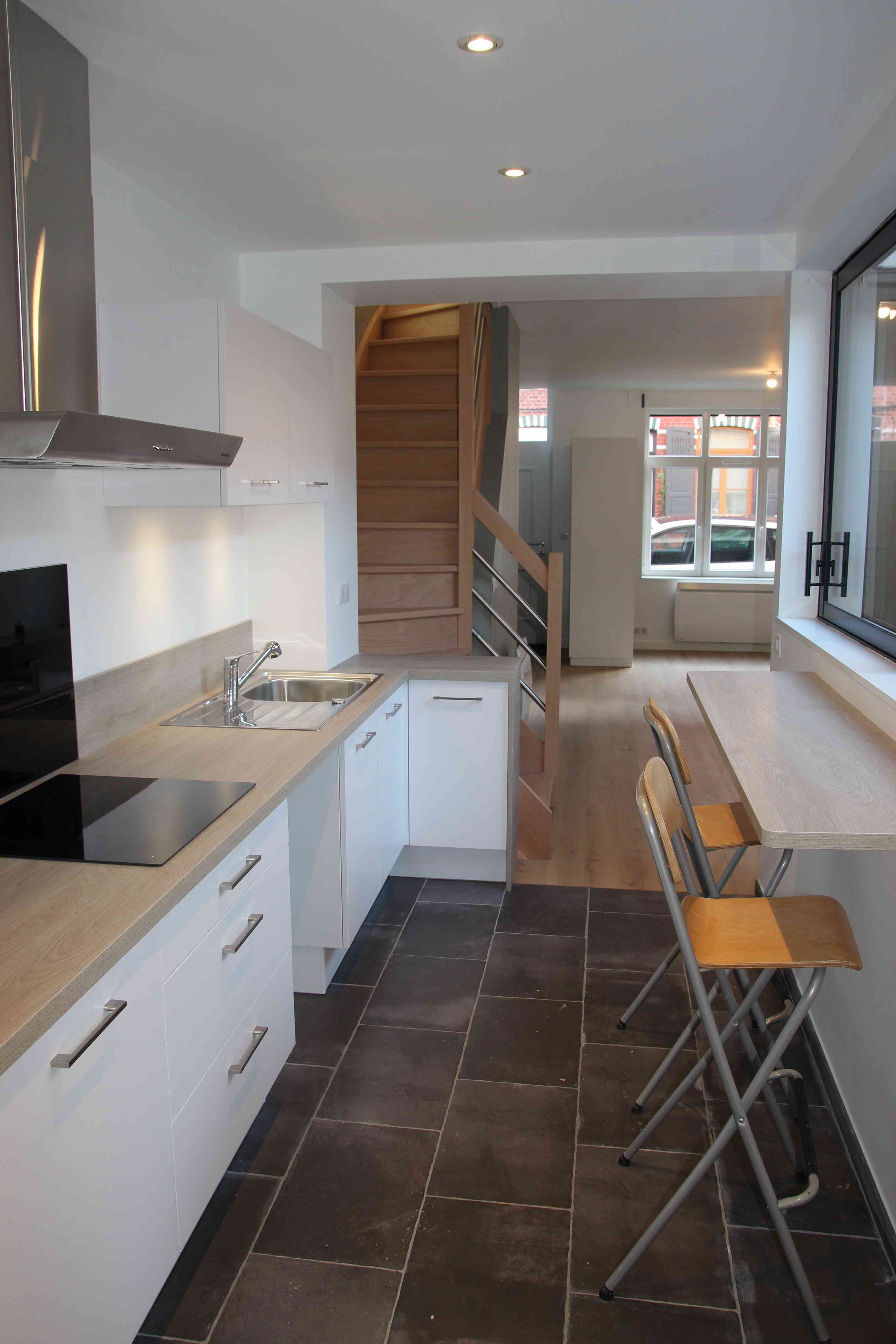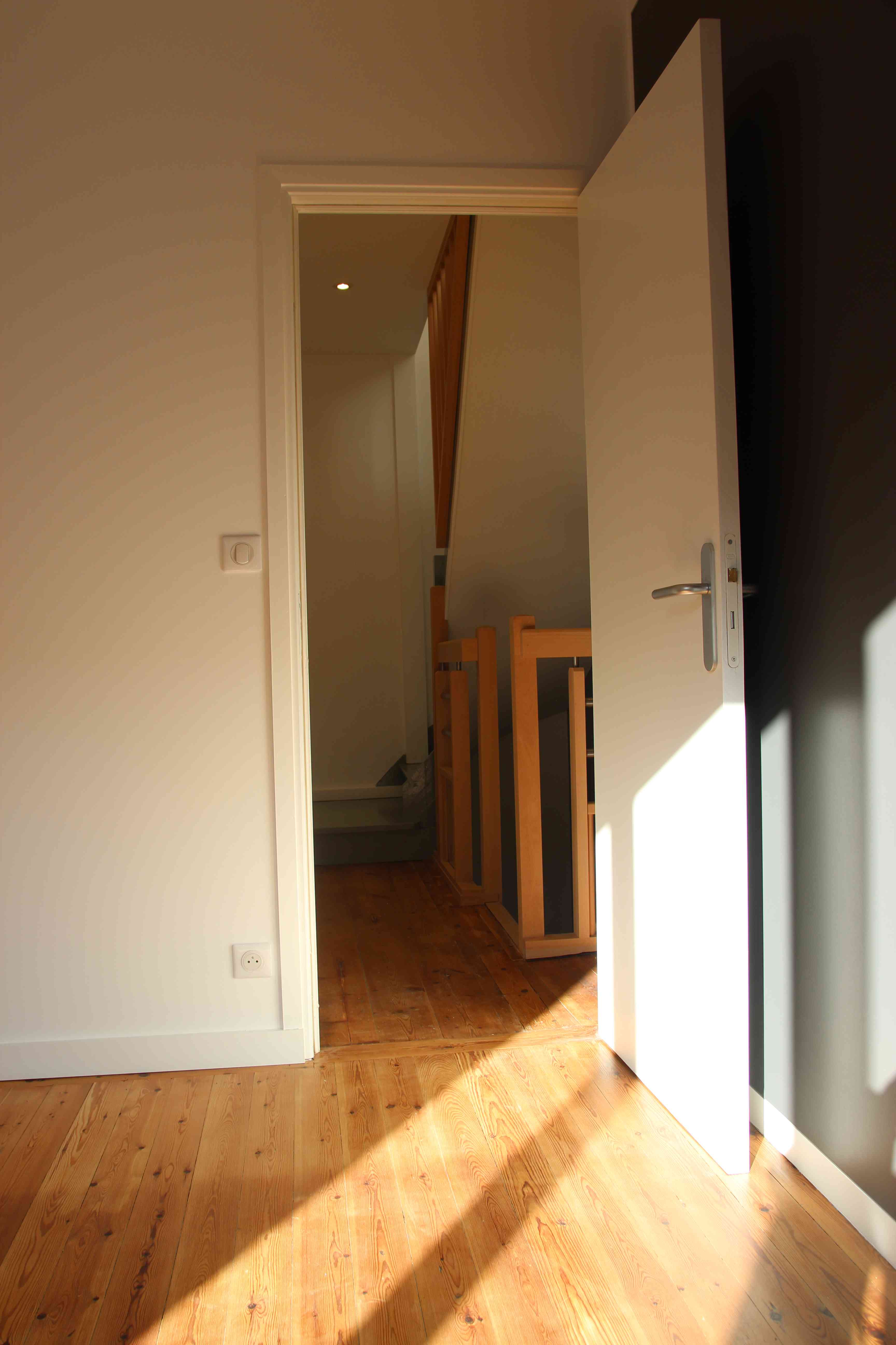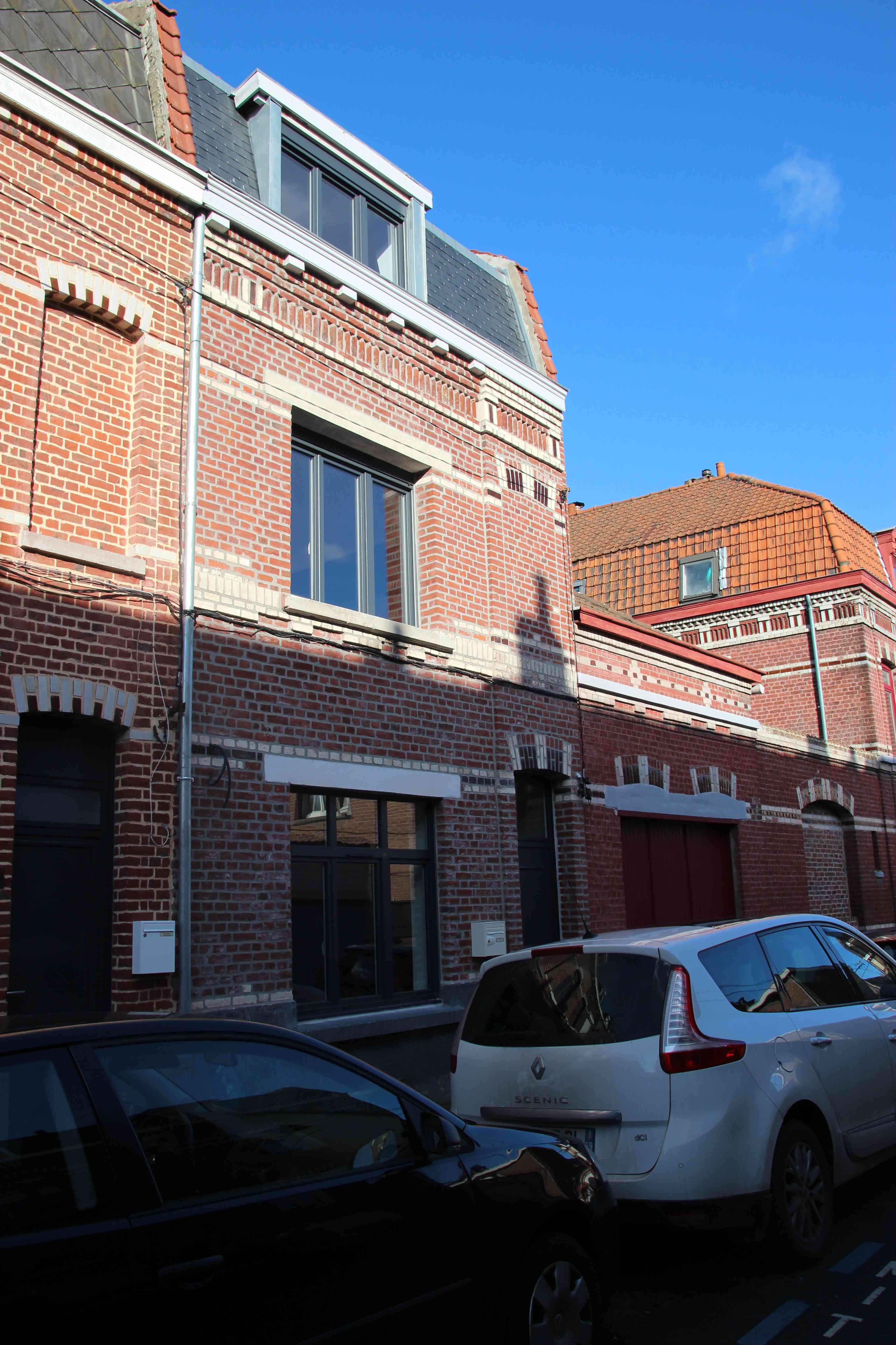 particuliersLa maison, laissée dans un état de délabrement abolu, a nécessité une rénovation totale. La partie arrière, ancienne cour couverte a été réouverte pour apporter de la lumière à la cuisine et créer un petit espace privatif à ciel ouvert, donnant également sur le séjour par une baie coulissante. Une ancienne chambre au 1° étage a cédé la place à une confortable salle de bains. 3 belles chambres ont été aménagées dont une avec mezzanine. Les planchers ont pu être sauvés dans les étages, apportant une touche chaleureuse à l'ensemble, alors qu'au rez de chaussée le cachet est apporté par l'association du parquet et des pavés type pierre bleue en cuisine et dans la cour. Le couloir d'entrée ayant été supprimé pour agrandir le séjour, un meuble vestiaire / bibliothèque sur mesure vient masquer l'entrée de la pièce de vie.