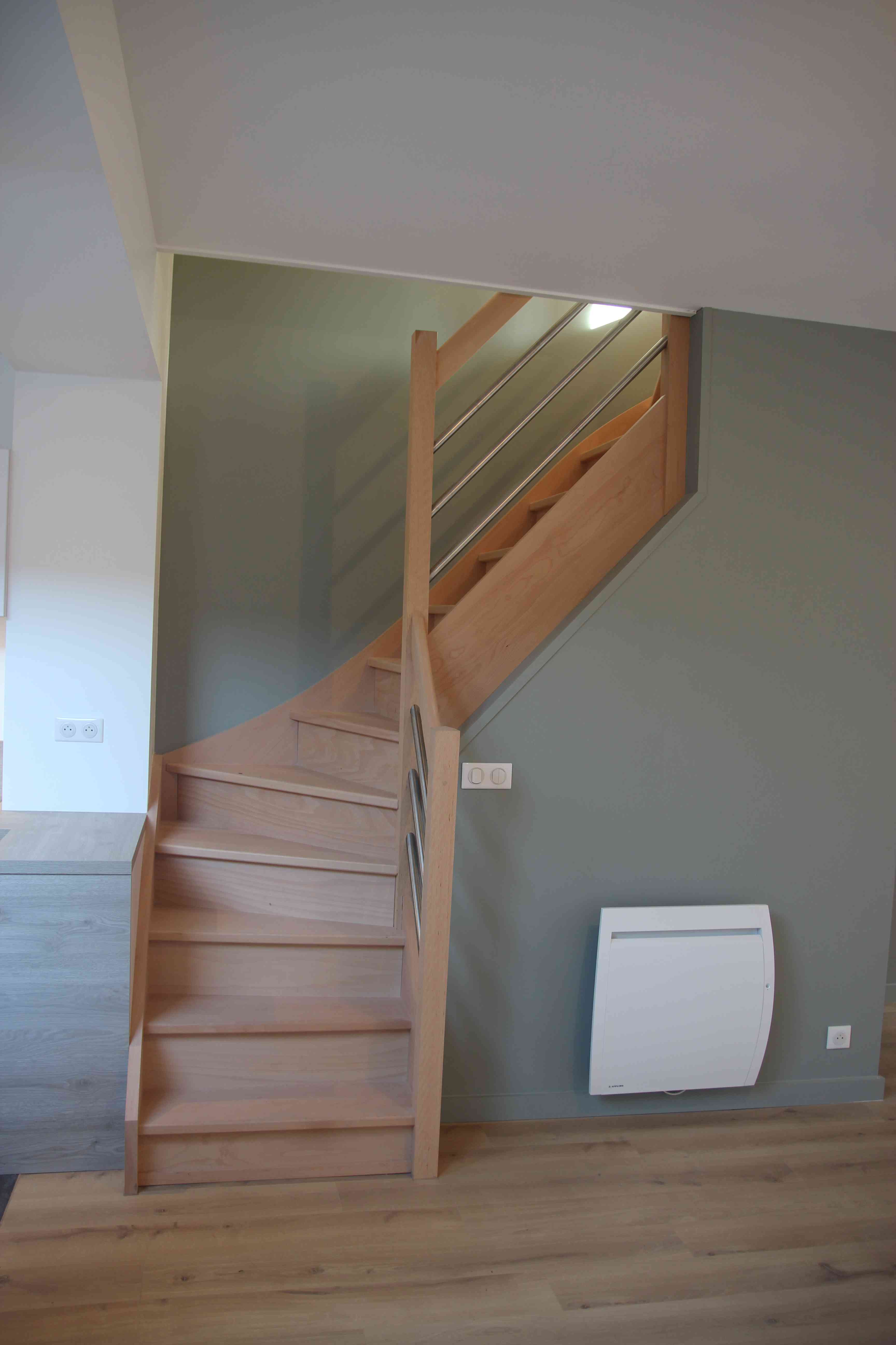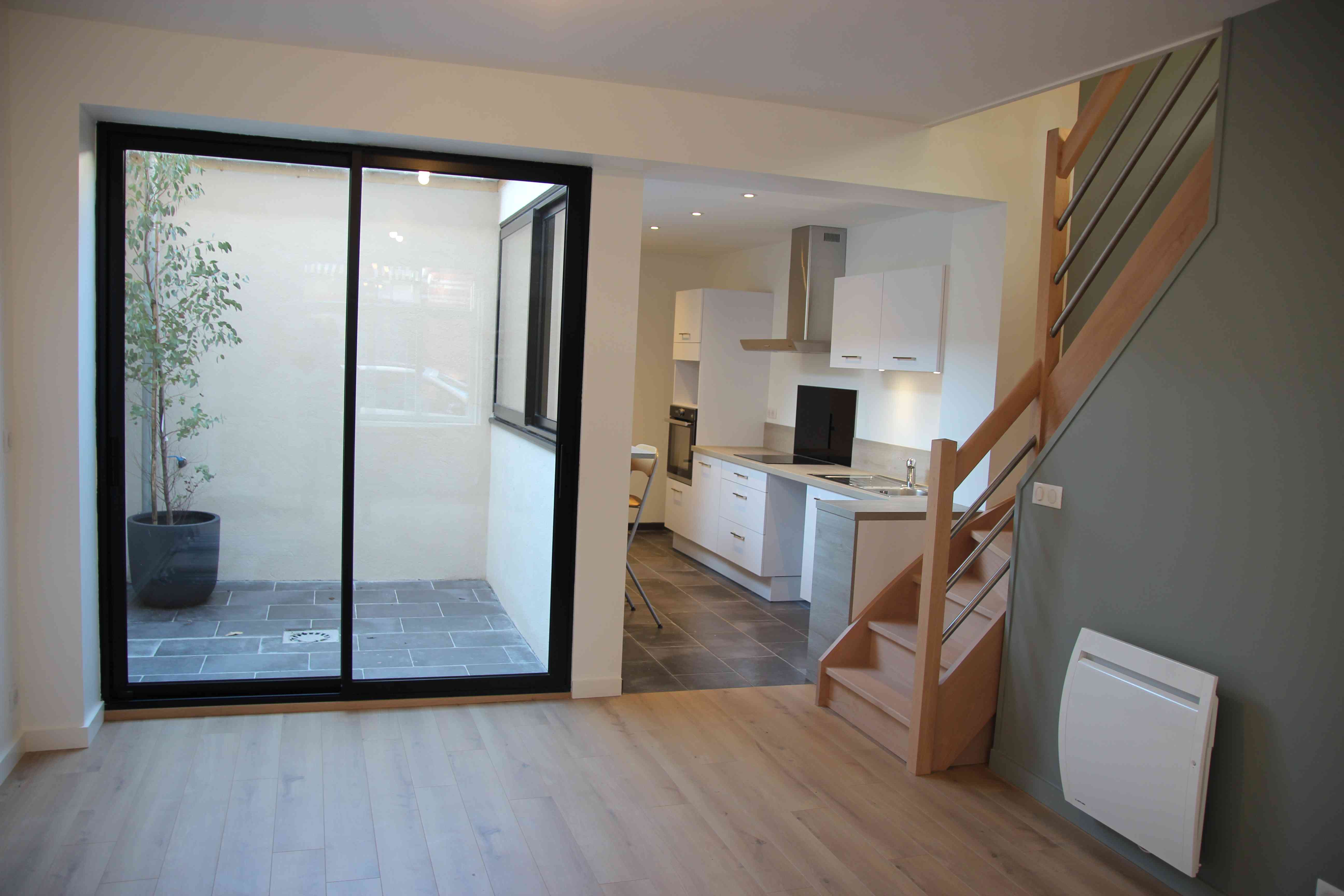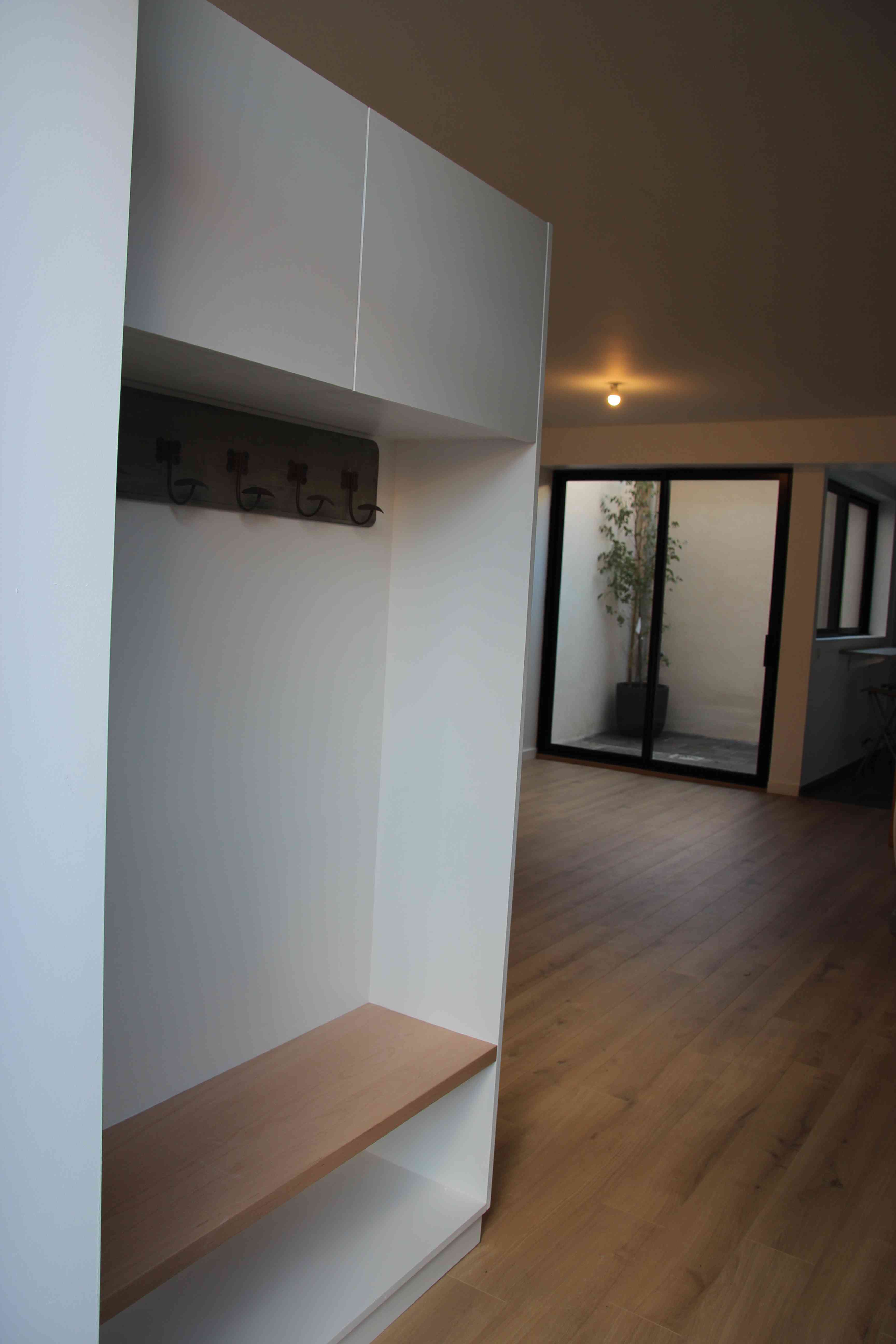 particuliersLa maison, laissée dans un état de délabrement abolu, a nécessité une rénovation totale. La partie arrière, ancienne cour couverte a été réouverte pour apporter de la lumière à la cuisine et créer un petit espace privatif à ciel ouvert, donnant également sur le séjour par une baie coulissante. Une ancienne chambre au 1° étage a cédé la place à une confortable salle de bains. 3 belles chambres ont été aménagées dont une avec mezzanine. Les planchers ont pu être sauvés dans les étages, apportant une touche chaleureuse à l'ensemble, alors qu'au rez de chaussée le cachet est apporté par l'association du parquet et des pavés type pierre bleue en cuisine et dans la cour. Le couloir d'entrée ayant été supprimé pour agrandir le séjour, un meuble vestiaire / bibliothèque sur mesure vient masquer l'entrée de la pièce de vie.