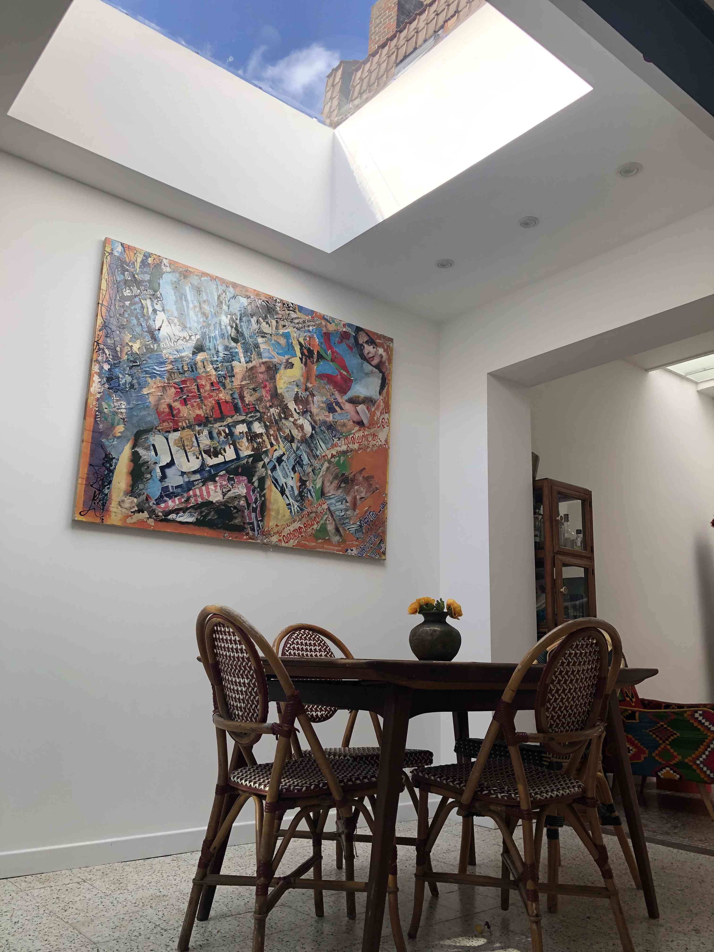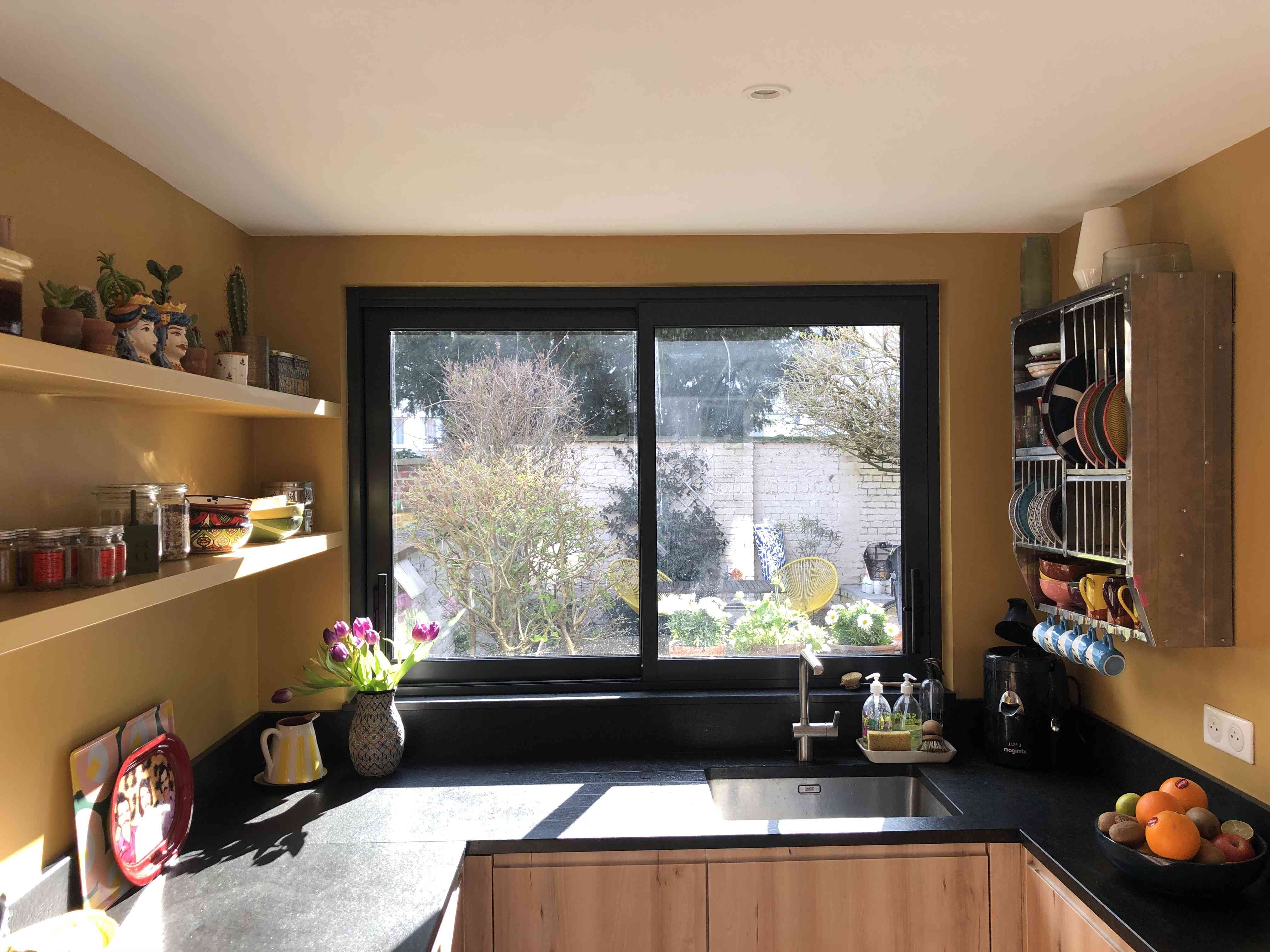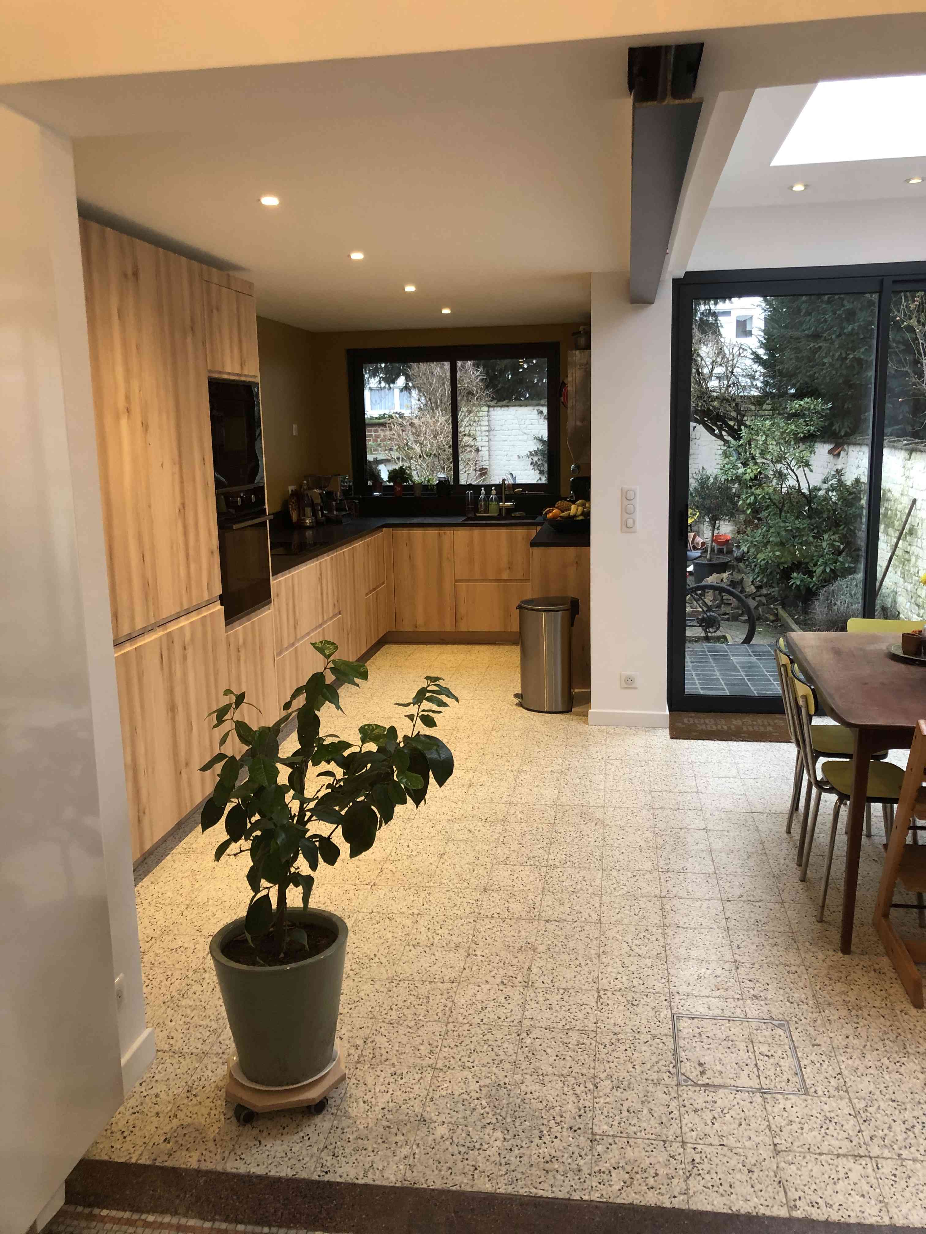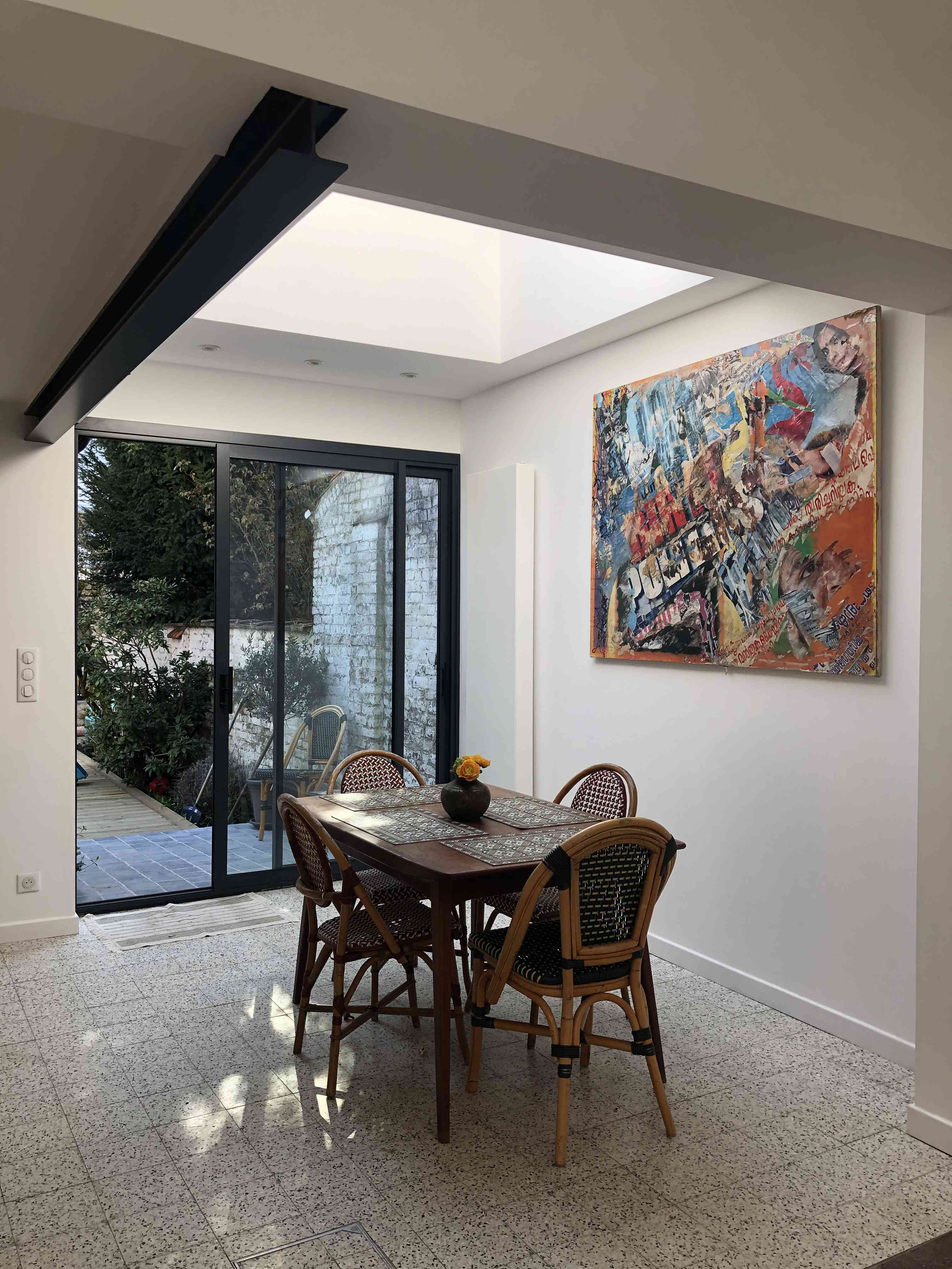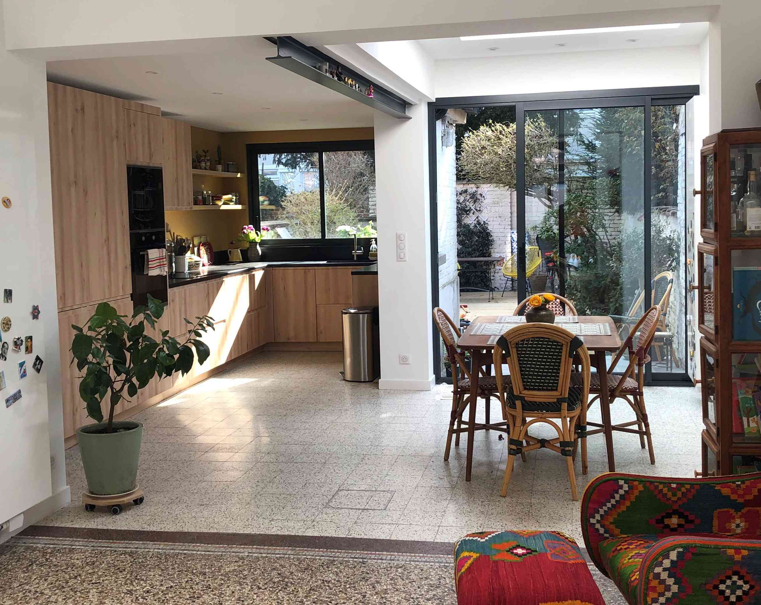 La cuisine et la véranda ont été réunies, le wc a été sorti des volumes de vie par la création d'un sas / vestiaire dans la prolongation du couloir d'entrée, et une large ouverture a été créée en salle à manger sur l'espace cuisine pour profiter du jardin. Un puit de lumière a été installé au dessus du coin repas faisant la part belle à la lumière zénitale.Un granit ancien, chiné par les propriétaires a été posé dans l'esprit du granito de la salle à manger.