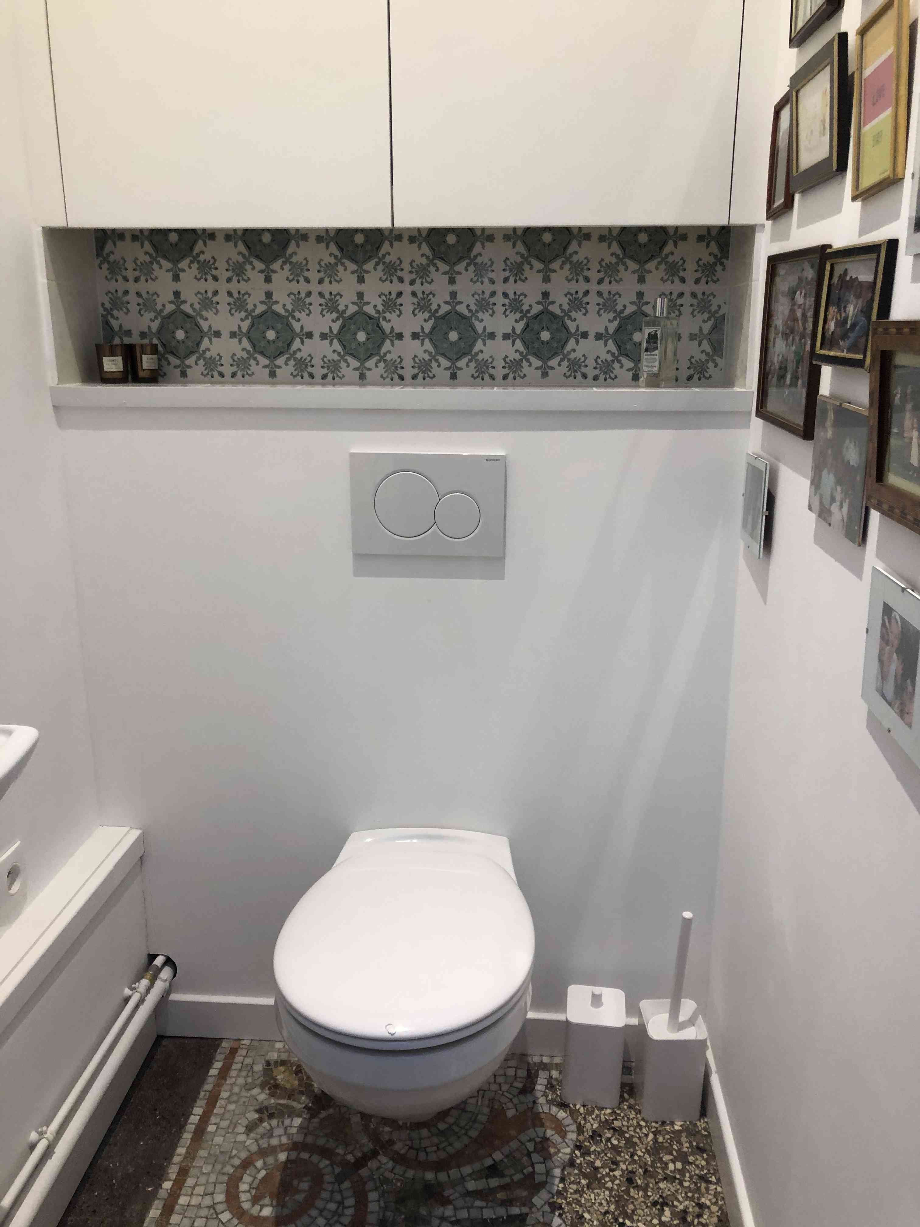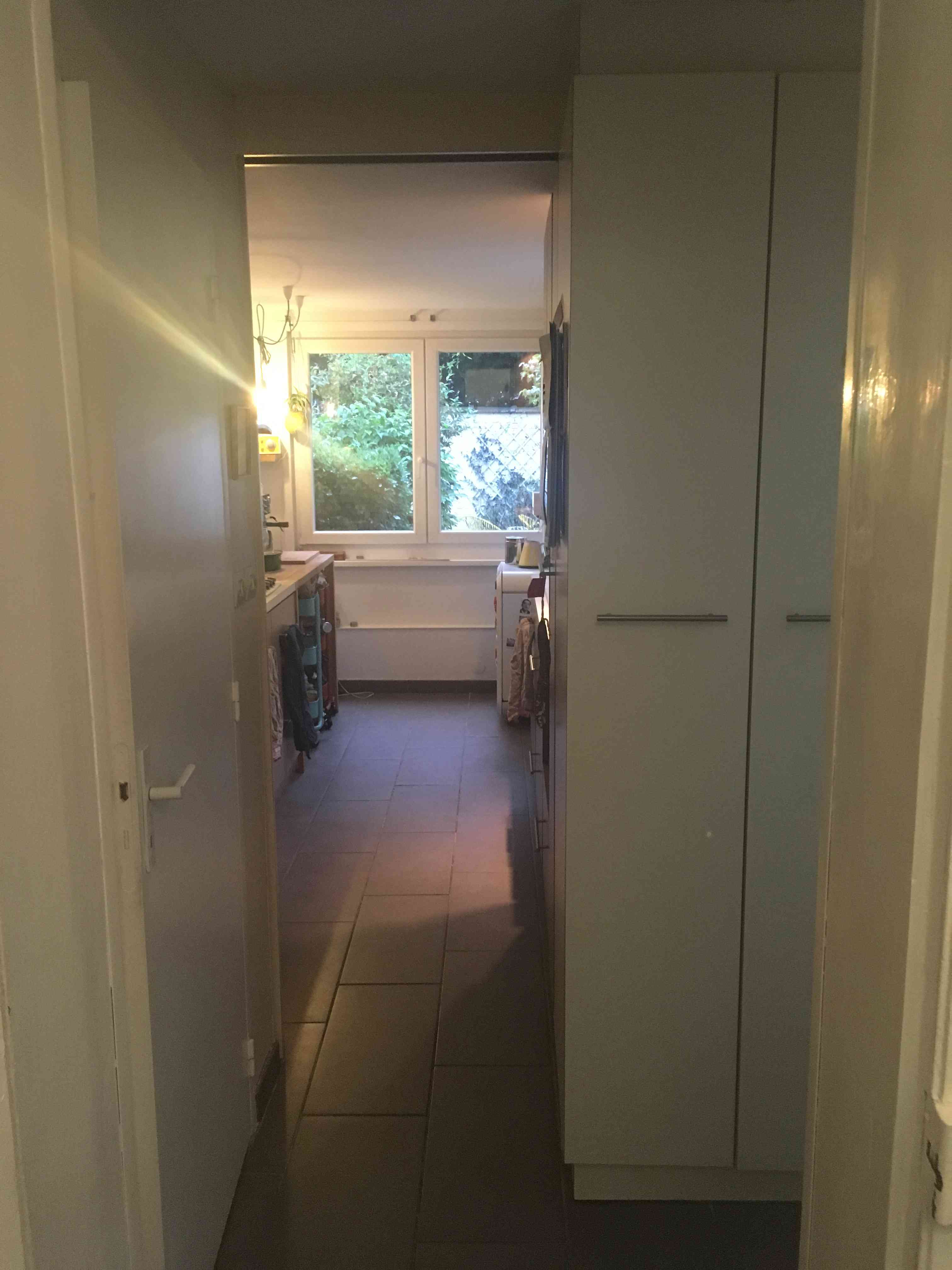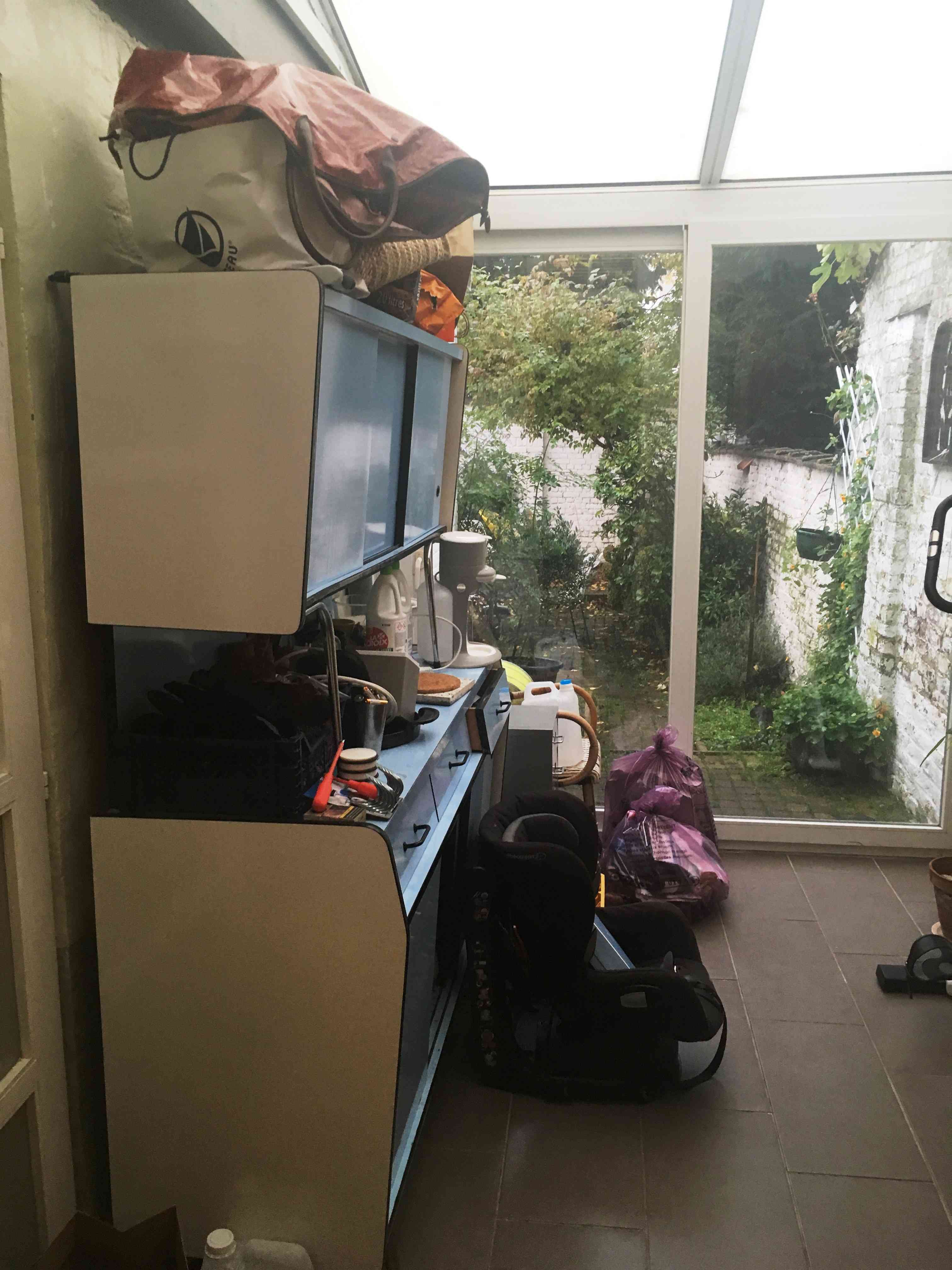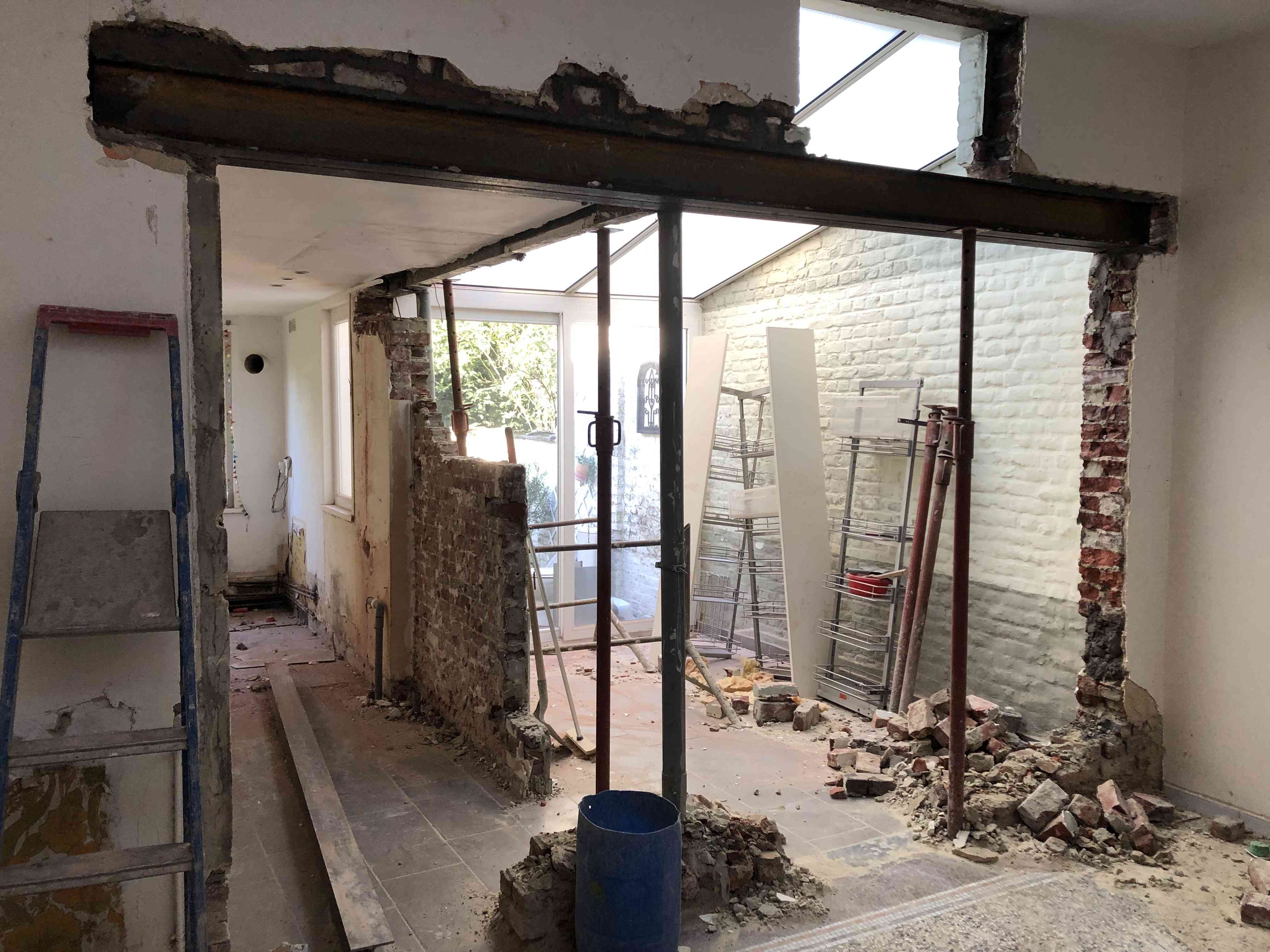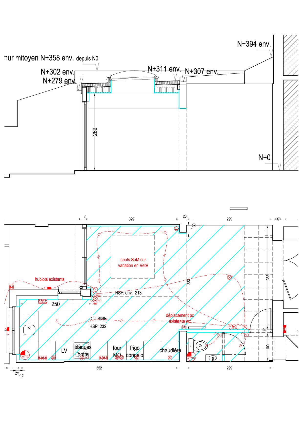 La cuisine et la véranda ont été réunies, le wc a été sorti des volumes de vie par la création d'un sas / vestiaire dans la prolongation du couloir d'entrée, et une large ouverture a été créée en salle à manger sur l'espace cuisine pour profiter du jardin. Un puit de lumière a été installé au dessus du coin repas faisant la part belle à la lumière zénitale.Un granit ancien, chiné par les propriétaires a été posé dans l'esprit du granito de la salle à manger.