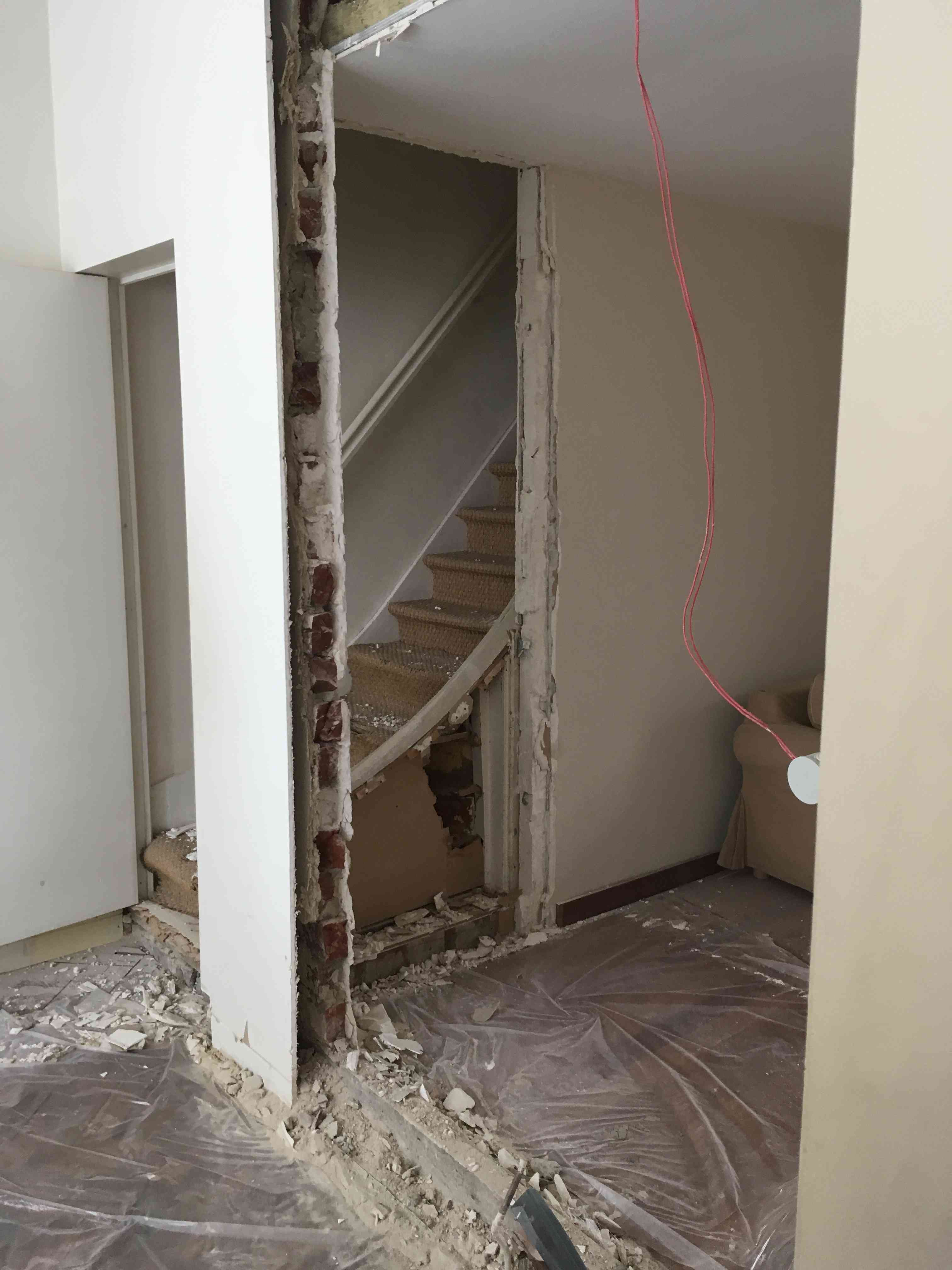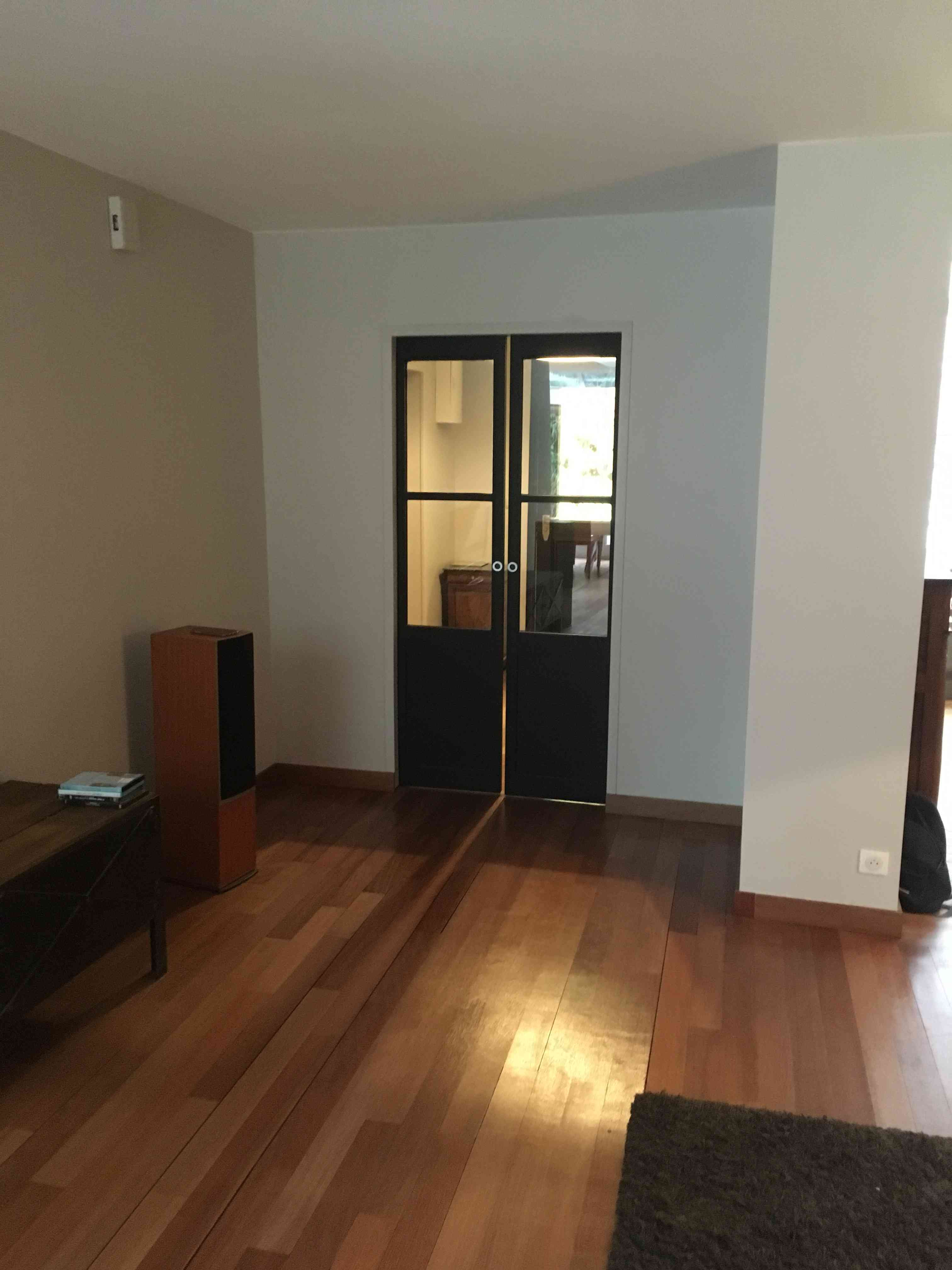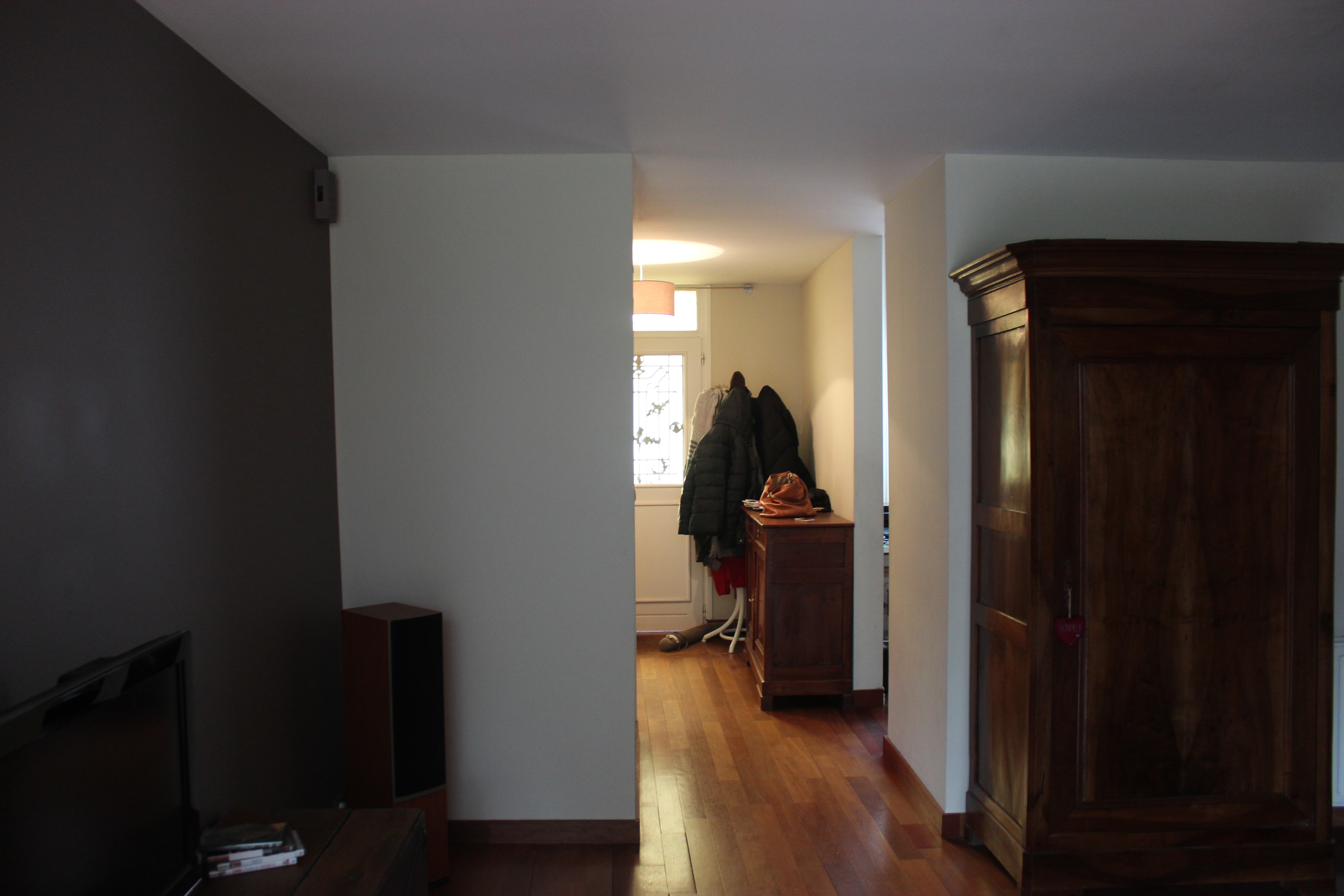 Le bureau sur rue a donc été ouvert sur le salon, l’escalier menant à l’étage, initialement accessible en traversant le bureau, a été dévoyé pour une meilleur fluidité vers les étages. Les toilettes, coupant l’entrée ont été déplacés dans le garage avec un accès direct depuis l’entrée